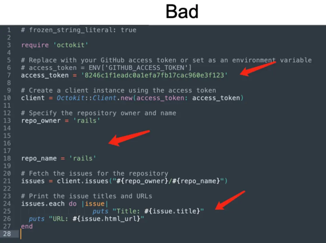 下圖展示的是 GitHub 安全事故:很多人在測試或調試代碼過程中,把一些 Token 放在裏面,無意識地推送到倉庫中,導致 API 和加密密鑰泄露,這很容易被人發現和利用,進而造成巨大損失。