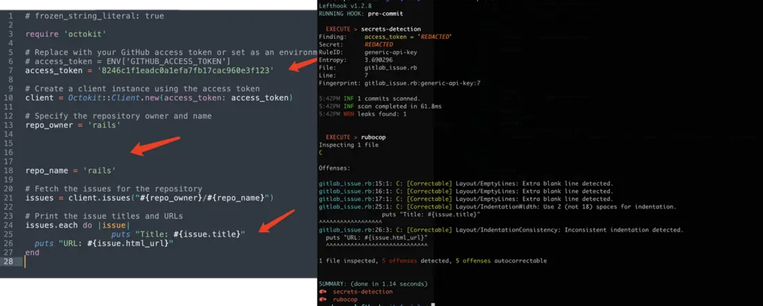把這段代碼推送到 CI 上,就會被檢測出問題,或者 Code Review 發現這些Token 不應該上傳,但這樣屬於事後處理,實際上,我們應該在提交之前處理掉這些問題。