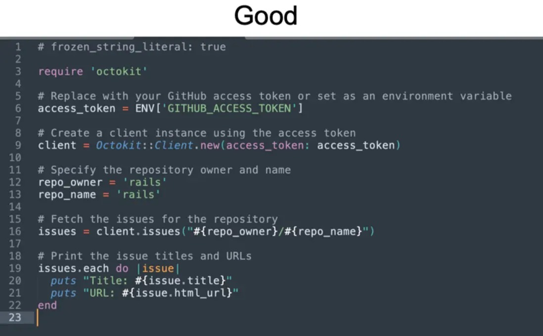 上圖是我第一次編輯的一段 Ruby 代碼:通過 ChatGPT 抓取 GitHub issue 的一個內容。可以看到,acces-token 是一個環境變量,生成一個client 接口,接着我們去抓取相關 issue 信息,最後把它們打印出來。