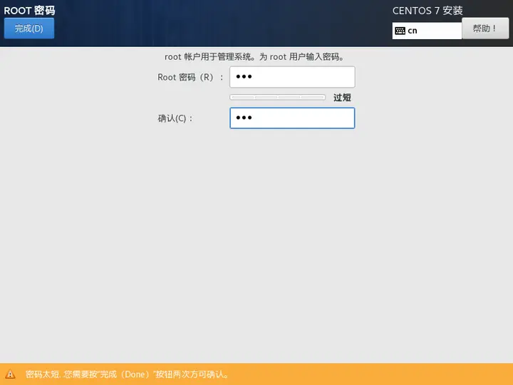 我這裏密碼設置“123”,由於密碼過於簡單,需要點擊兩次“完成”: