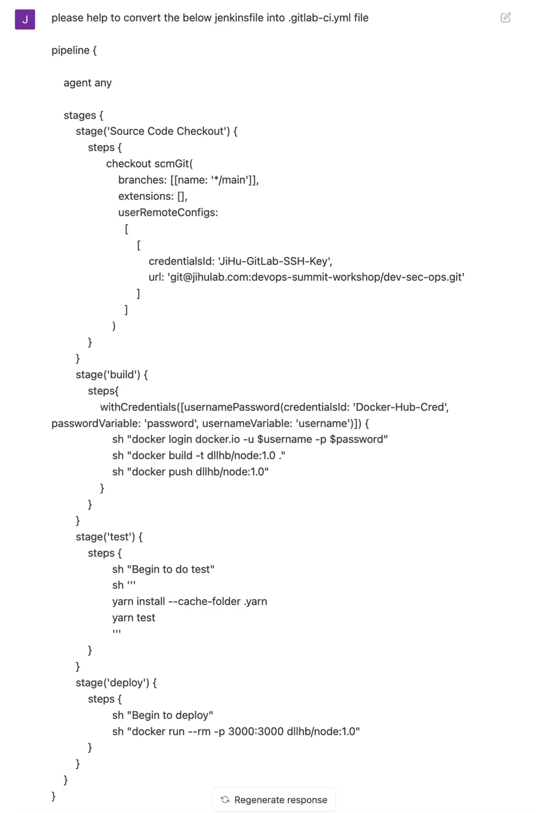 下面用 ChatGPT 將上述的 Jenkinsfile 轉換成 .gitlab-ci.yml 。