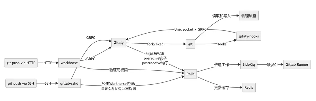 極狐GitLab 的服務並不是一個單體,我們以大版本 15 為例,和 git push 有關的組件有下面這些: