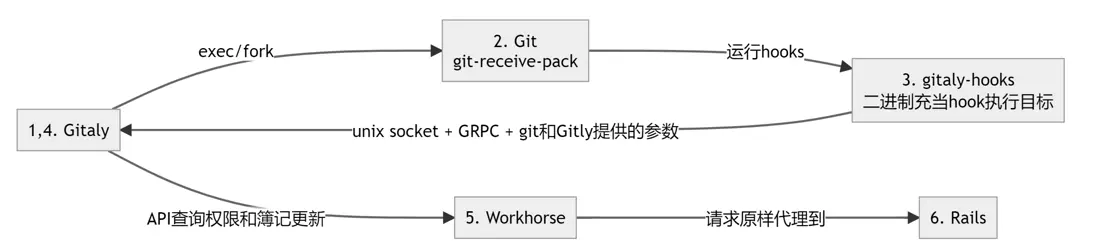 gitaly-hooks 在被 git-receive-pack 啓動後從環境變量讀取 GITALY_HOOKS_PAYLOAD,通過 Unix Socket 和 GRPC 連接回 Gitaly,告知 Gitaly 目前執行的 Hook,以及 Git 提供給 Hook 的參數。