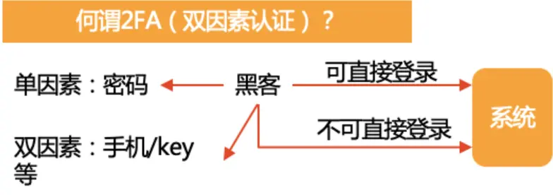 2FA 雙因素認證開啓後,除了用户名密碼外,還需要提供第二層認證因素(比如手機驗證碼)才可以登錄賬號,能夠有效防止用户在不小心丟失用户名密碼的情況下,賬號被惡意登錄使用。