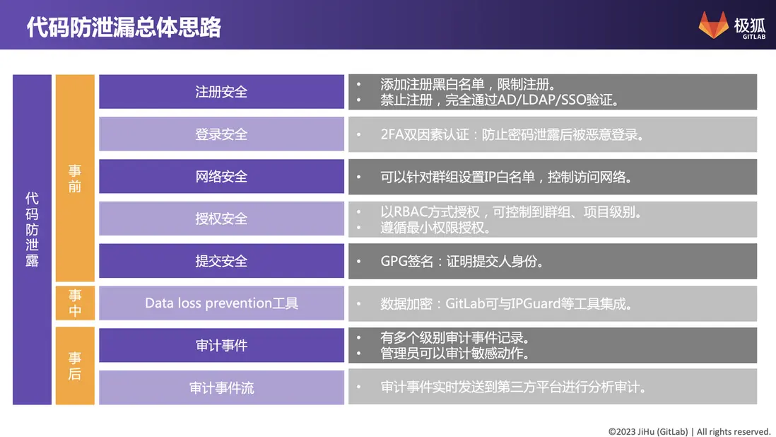 最後是「事後」措施。它主要是對極狐GitLab 中所發生的事件、人員行為進行記錄、分析、追蹤,甚至是告警,以實現對代碼泄露事件的防範或追溯。