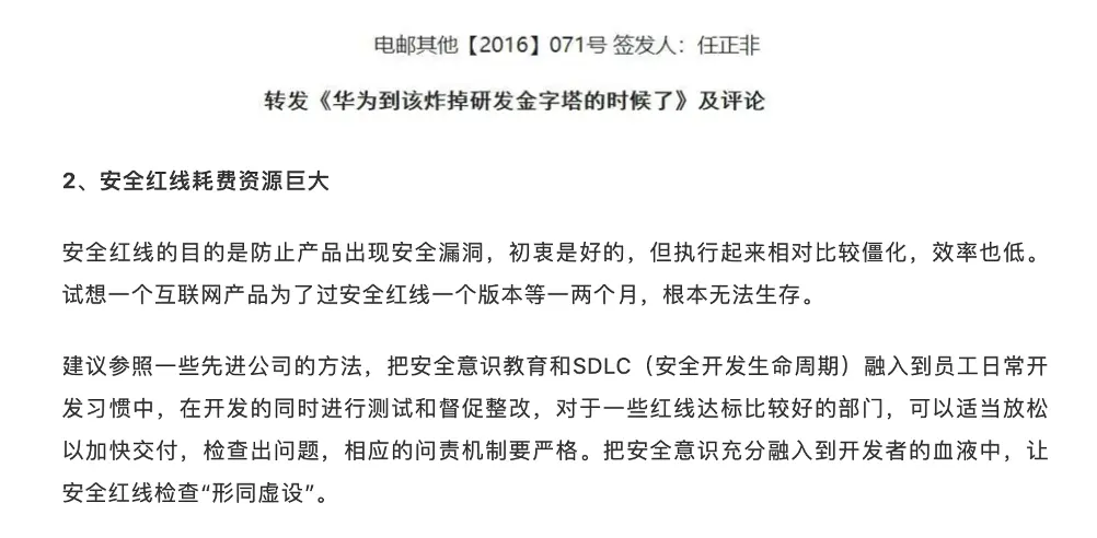 如下圖,華為內部有一套安全紅線,包括了安全基線、規範標準指導書、各種各樣的掃描工具,每個項目研發流程需要遵循這一套機制,運行各種審核,各種節點確認,來保證產品和項目交付安全,可想而知其成本之高和效率之低。