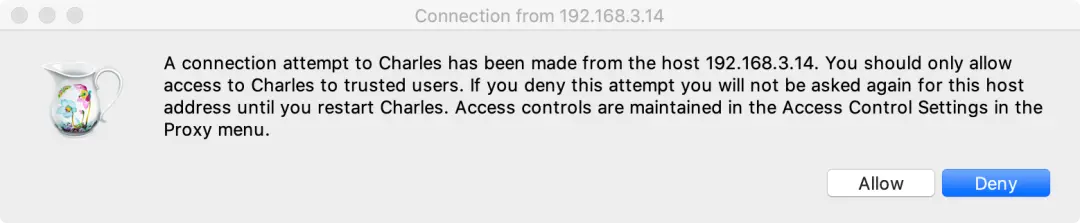 手機端 對連接wifi 進行代理設置,設置手動代理,將charles 提示的代理地址 設置好,然後charles 就會有一個提示: