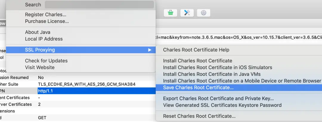 首先下載Charles ,打開之後點擊Help->SSL Proxying -> Install Charles Root Certificate 安裝根證書