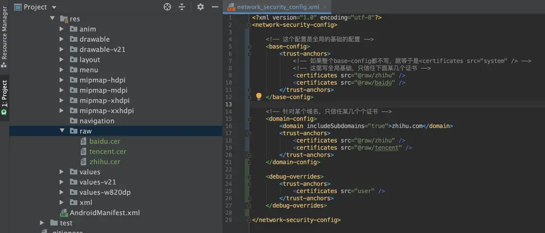 步驟②:放進 res/raw 文件夾裏,在network_security_config.xml 裏寫上相關配置