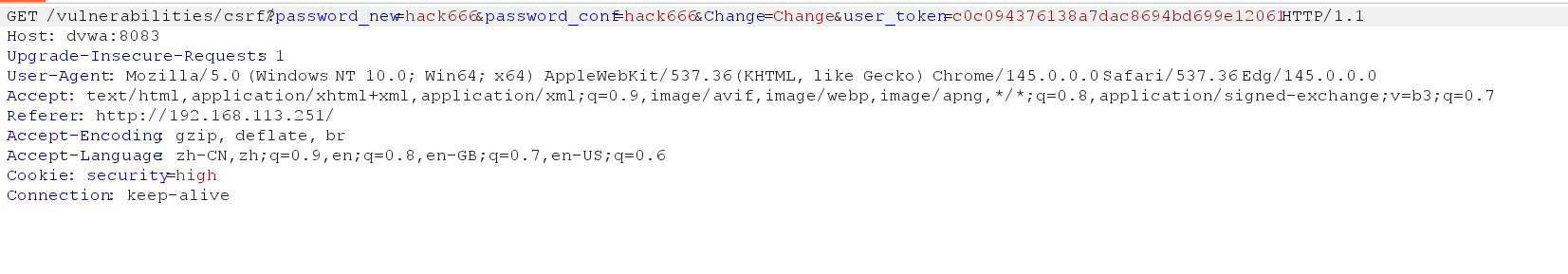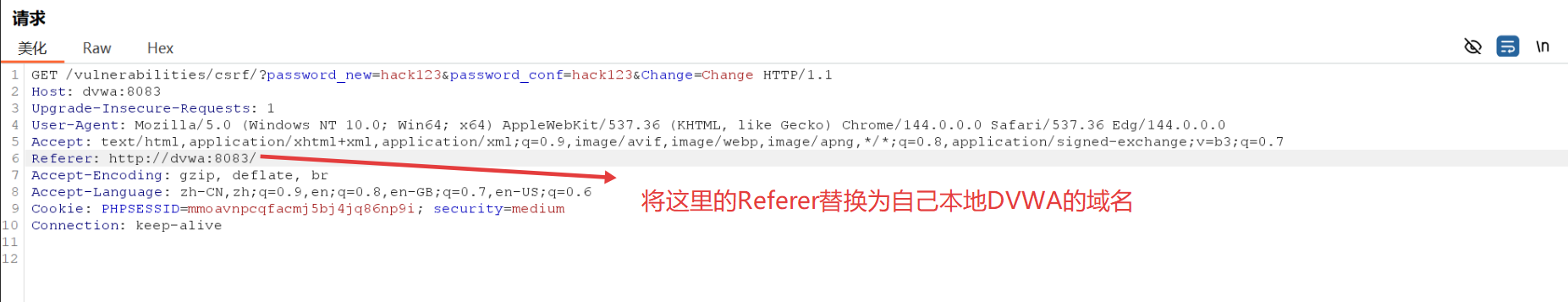 所以要想成功修改密碼,就要使Referer字段嚴格等於目標網站域名,即http://dvwa:8083(這裏看你自己的本地域名),我們可以使用burpsuite來修改HTTP頭部的Referer字段。