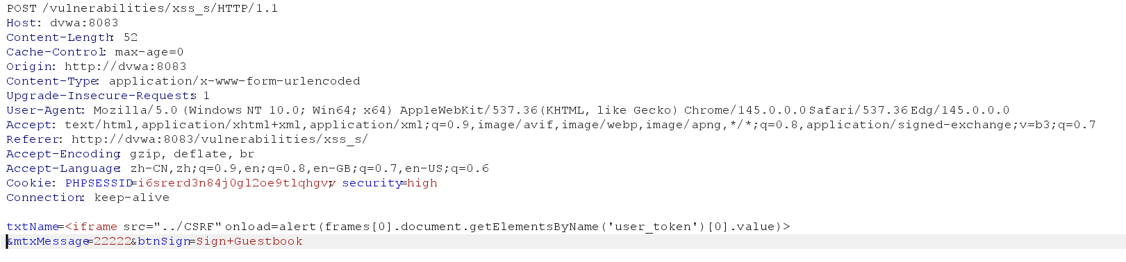 iframe 是 HTML 標籤,作用是在當前頁面中嵌入另一個頁面。src="../CSRF" 是相對路徑:存儲型 XSS 頁面的路徑是 /vulnerabilities/xss_s/,而 CSRF 頁面的路徑是 /vulnerabilities/csrf/,用 ../CSRF 就能正確跳轉到 CSRF 模塊的頁面。