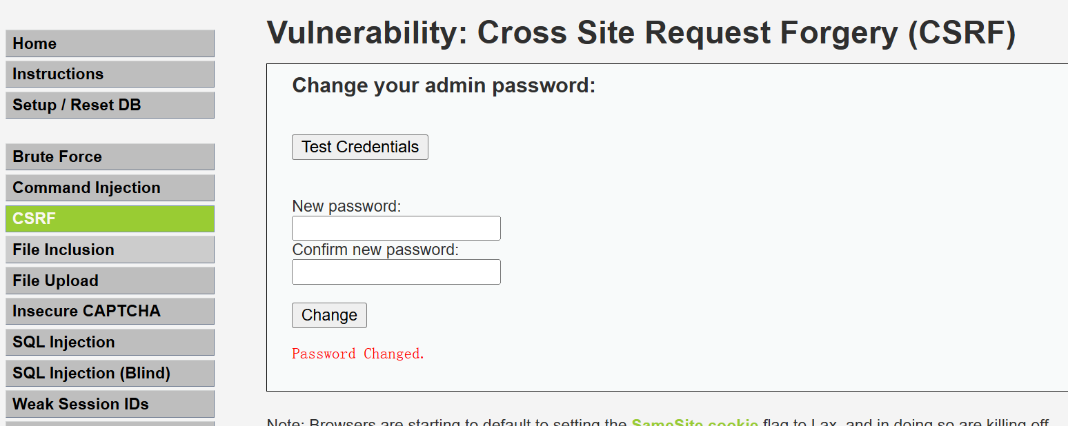 簡要概述完CSRF的基本概念後,我們開始練習DVWA中CSRF訓練的low到high級別的關卡。