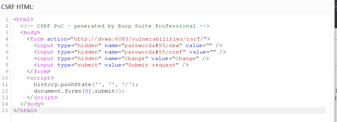 <form action="http://dvwa:8083/vulnerabilities/csrf/?" method="GET"> <!--此處根據自己的靶場地址替換 -->