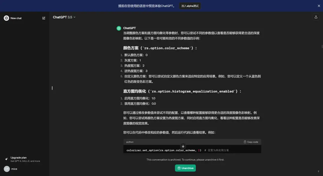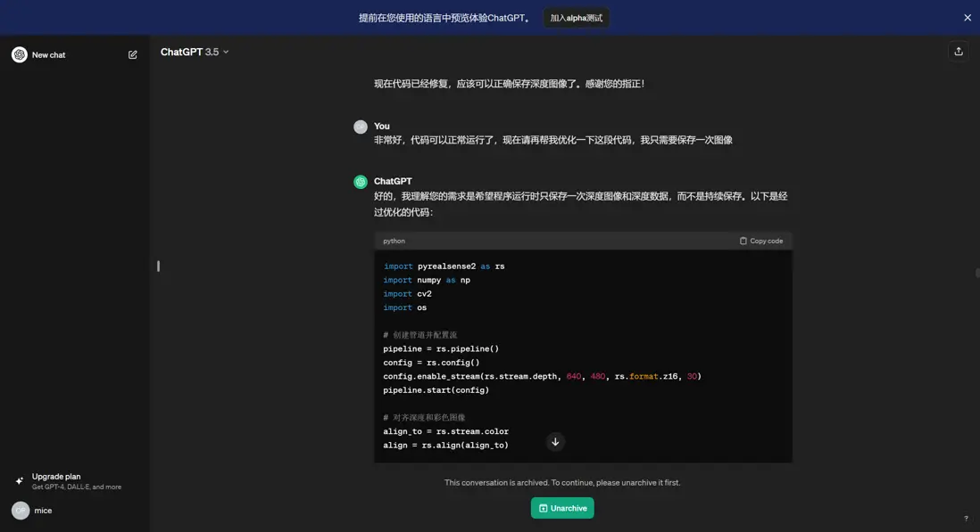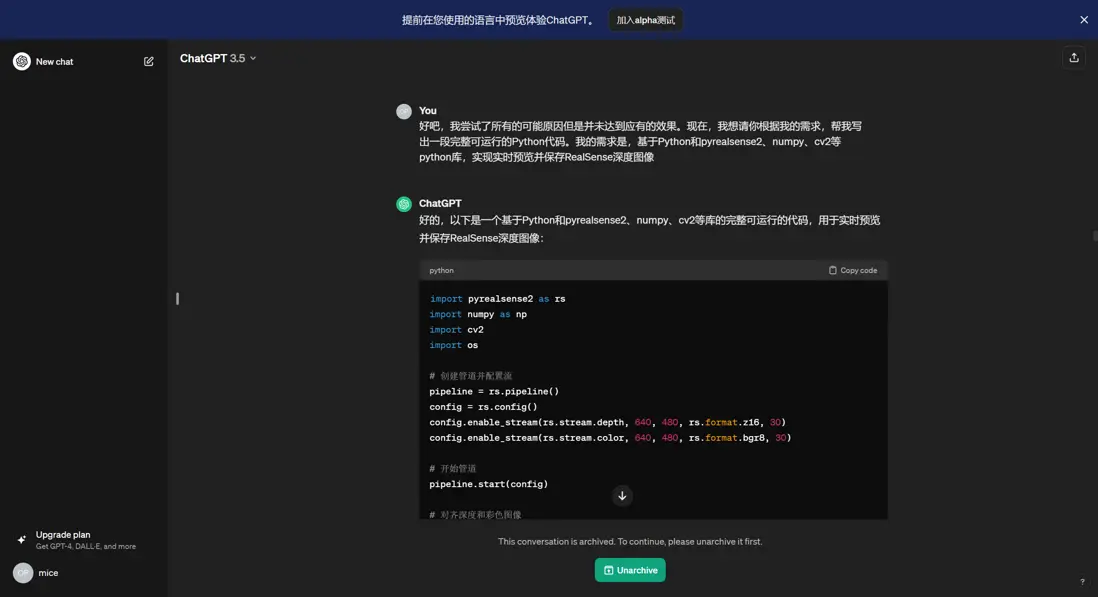 對話開始時,先給 ChatGPT 一個預設身份,例如我給它的預設身份就是一個精通 OpenCV 和 Intel RealSense 傳感器的 Python 程序員