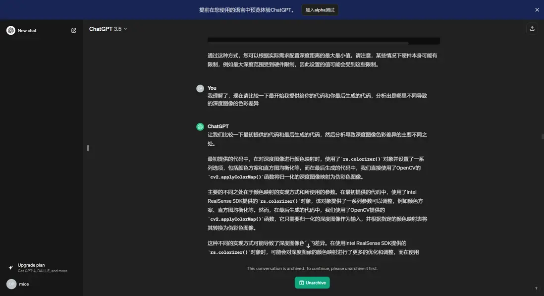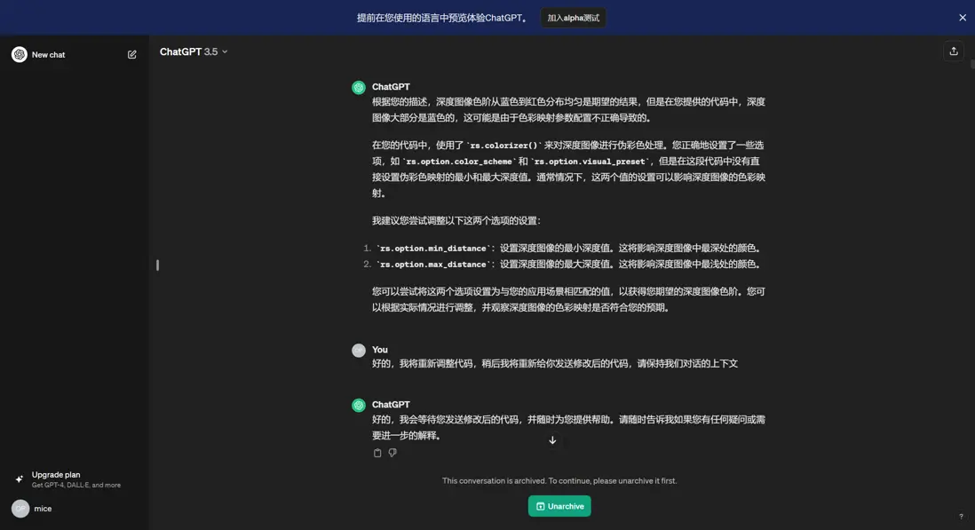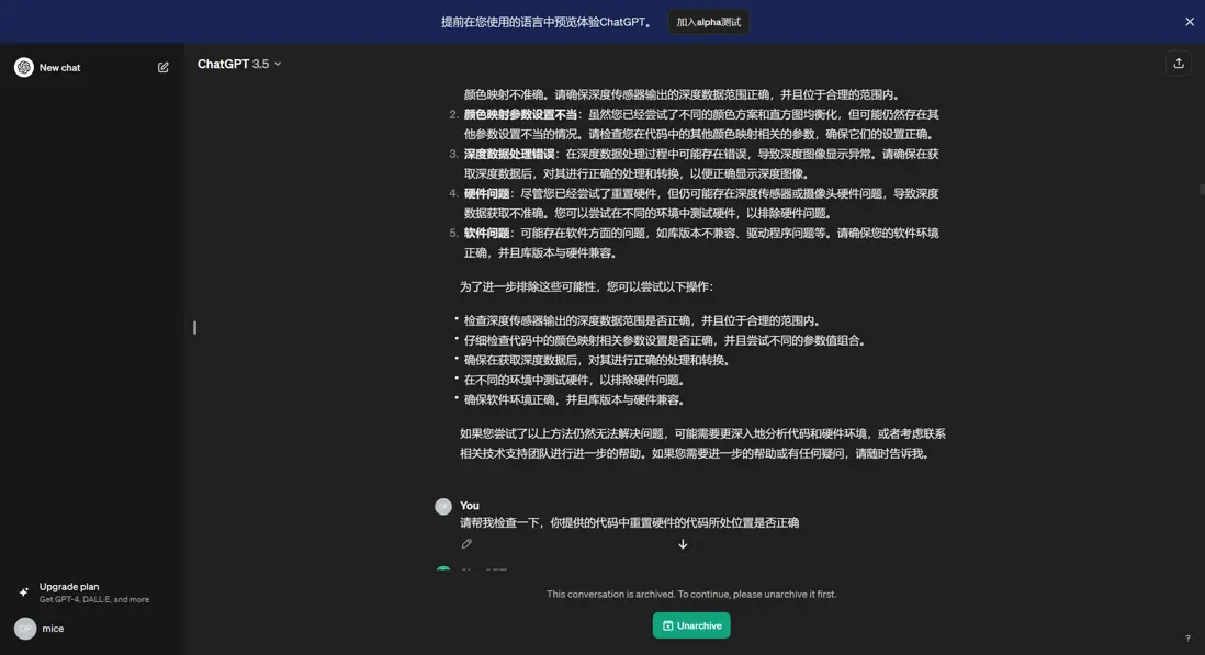 在確定 ChatGPT 對代碼理解沒有大的偏差以後,我就提出了我想解決的問題。簡單補充一下問題背景,RealSense 是一款深度相機,可以獲得拍攝物體的距離信息,在官方的軟件上會以熱力圖的形式展示,而我所編寫的代碼所得到的深度圖像是藍色的,而不是像官方軟件一樣由紅色到藍色變化。我高強度 Google 搜索了接近兩天,圖中提到的着色器配置和直方圖均衡化就是我所蒐集到的線索信息,但是不論怎麼調試都不起作用,於是想到了 ChatGPT。我就把這兩點作為問題排查的方向提供給了 ChatGPT,這也是一個 AI 協作的小技巧吧,當你搜索到一些可能對解決問題有幫助的信息時,可以提供給 AI 這樣可以大大縮短解決問題所需的時間。