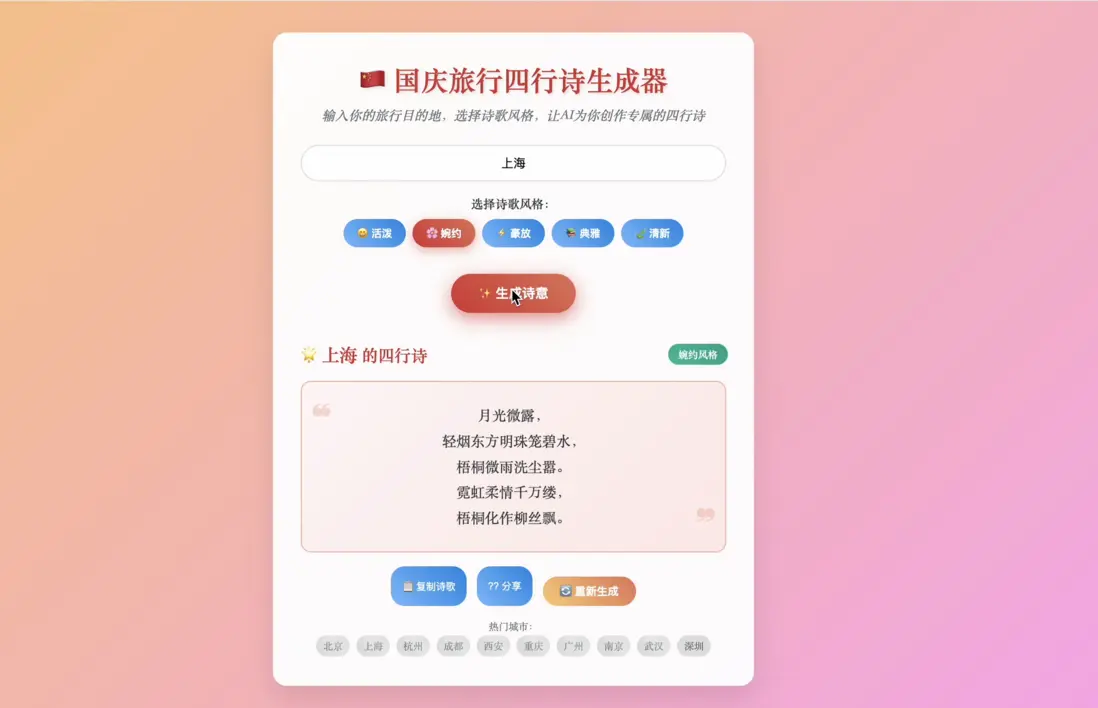 國慶已至,小夥伴們都要去哪裏旅行呀?是人傑地靈的杭州,還是熱辣滾燙的重慶?不如就用Zulu開發一個“國慶旅行4行詩網站”,用詩情畫意,勾勒出祖國山河的美好~