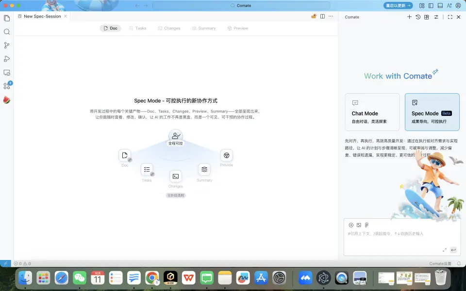 - Spec 採用的是 Pipeline 規格化邏輯:需求 -> Doc 確認 -> Tasks 確認 -> 代碼生成 -> 可視化變更 -> 預覽驗證。 Spec 模式引入了兩個關鍵的“人工確認環”,將開發者的角色從“代碼搬運工”轉變為“架構架構師/審核官”。