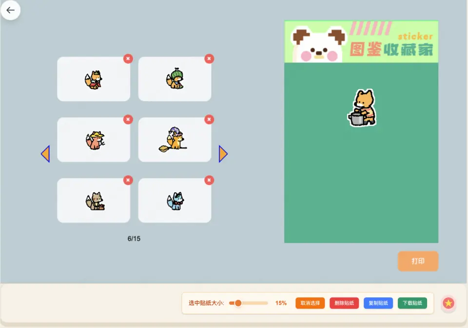 - 給畫完的畫做了洪水填充效果,並且加了描邊效果,看起來像貼紙一樣,貼紙可以直接複製到剪切板,直接發送到聊天框或者文檔,也支持一鍵下載單個貼紙,而非整個貼紙;