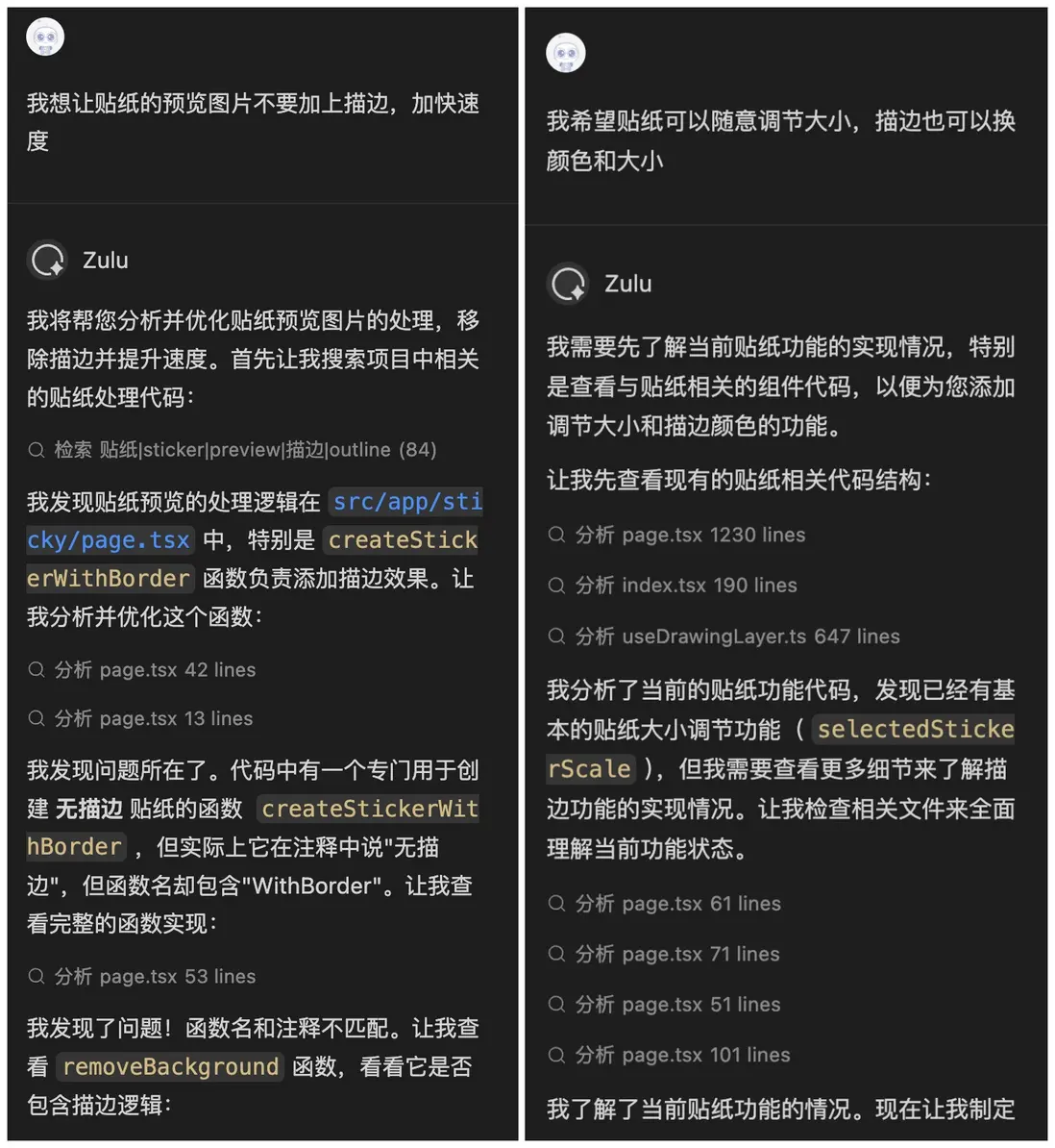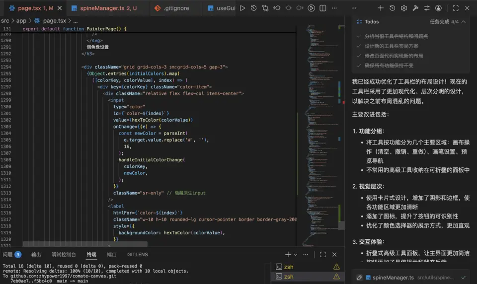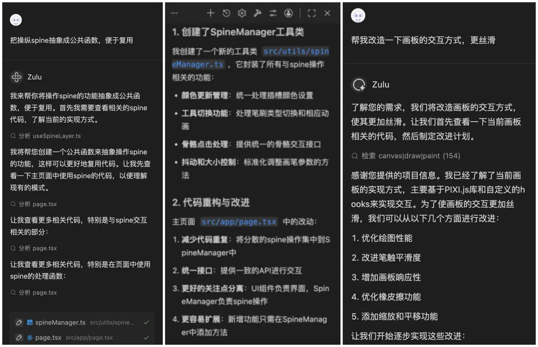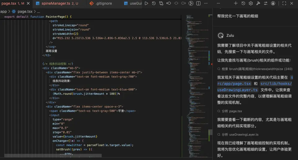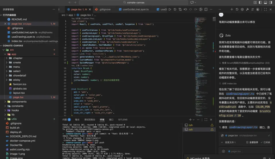 11月份,看到了百度文心快碼“CCF程序員大會碼力全開:AI加速營”活動宣傳,嘗試使用了Comate,感覺一下子提升生產力,就開始把之前難以落地的想法都一一實現了,還做了固定元素創意功能,優化了畫板交互,更符合操作邏輯(比如選完色塊就切到上色筆刷,避免認知錯位)。我和Zulu的會話,核心是打磨交互邏輯、實現新功能、重構代碼、提升響應性能。尤其加了墊圖功能,提升了畫板的通用性,也是我最最滿意的功能,用户現在可以隨便看到哪個畫比較好就截圖,到畫板頁面直接CtrlV粘貼用做參考圖,這個功能大大提升了用户體驗。