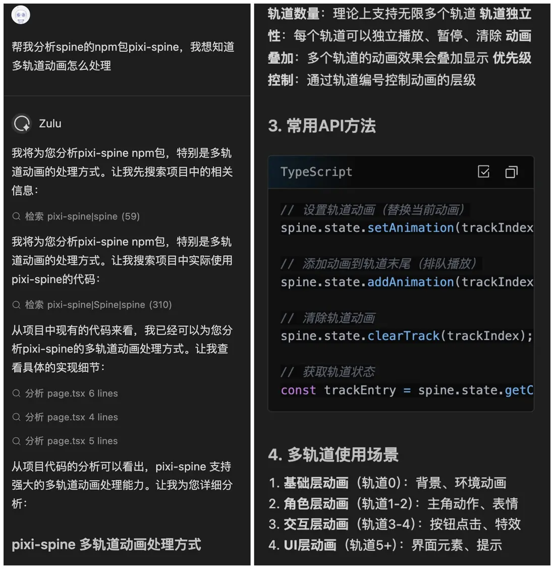 詢問Comate多軌動畫處理方式,Comate列出了API方法