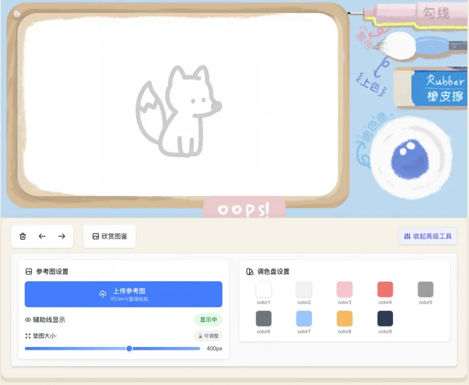 - 有撤銷回退功能(可以回退20步),能夠一鍵清空畫布,可以自由調節色板,靈活用色;