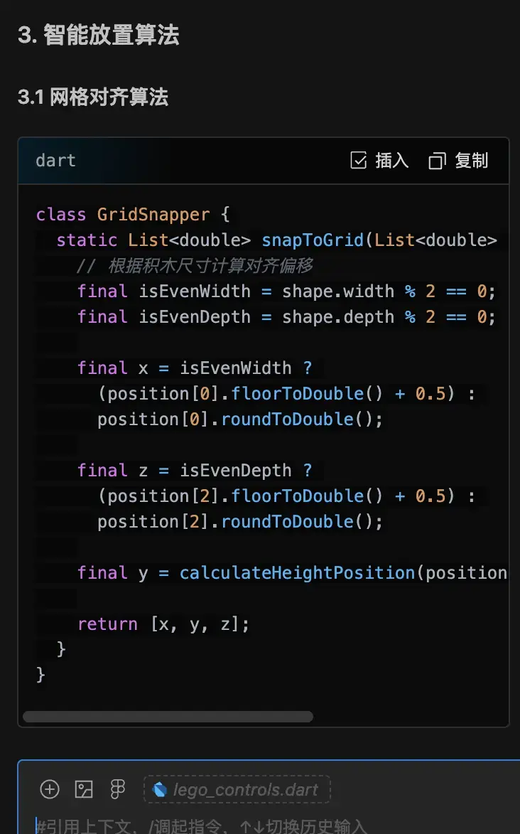 3D積木渲染是整個項目的技術核心,涉及到複雜的3D數學計算和圖形學知識。我告訴Comate:"要支持積木的拖拽、旋轉、碰撞檢測,幫我找合適的方案,先不要修改。"它提出了好幾種算法,我確認沒問題後,再讓AI開工。