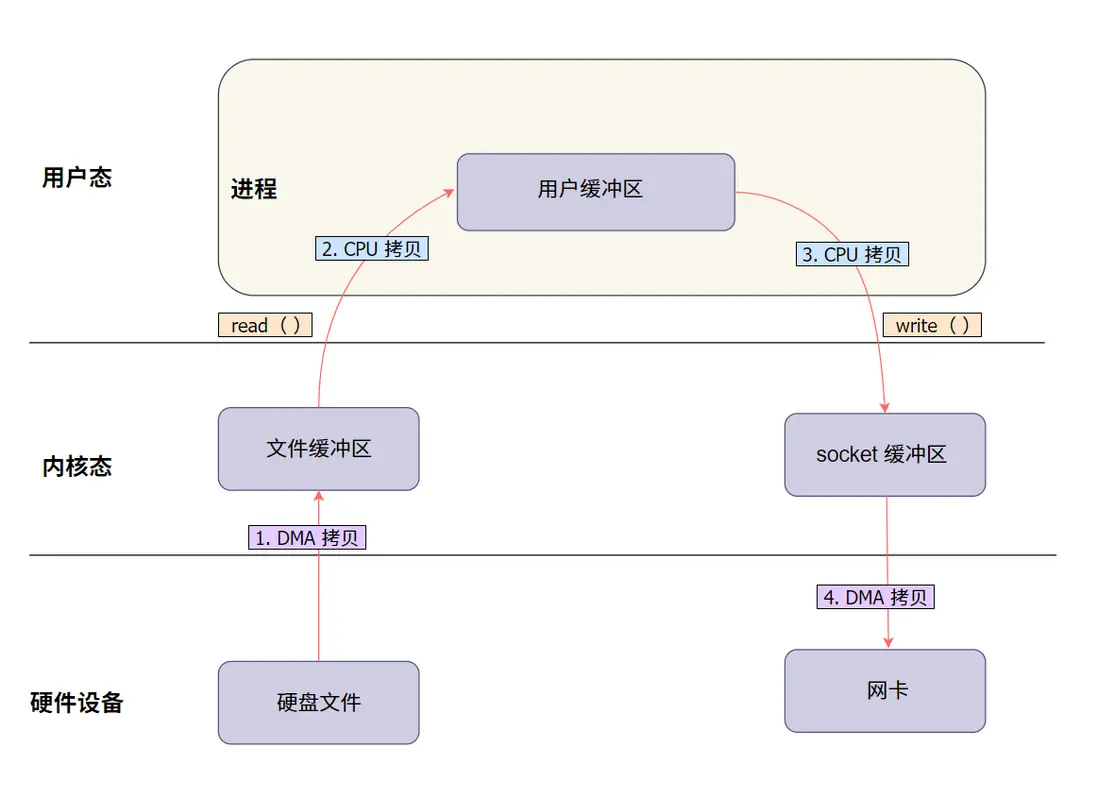 write()調用觸發,CPU 負責拷貝) - 內核緩衝區 -> 網卡(最終發送數據,CPU 參與傳輸)