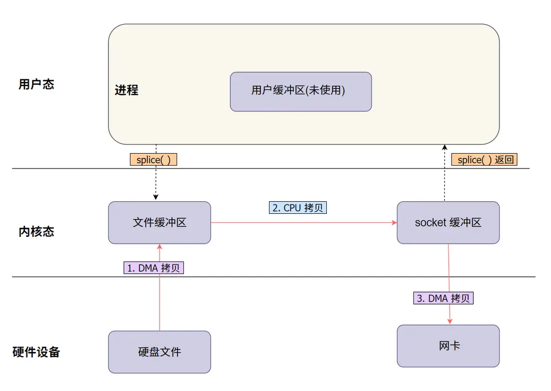 splice系統調用將數據從輸入文件描述符(例如硬盤文件)讀取,數據直接通過 DMA(直接內存訪問)進入內核緩衝區。 - 傳輸到網絡 socket:隨後,