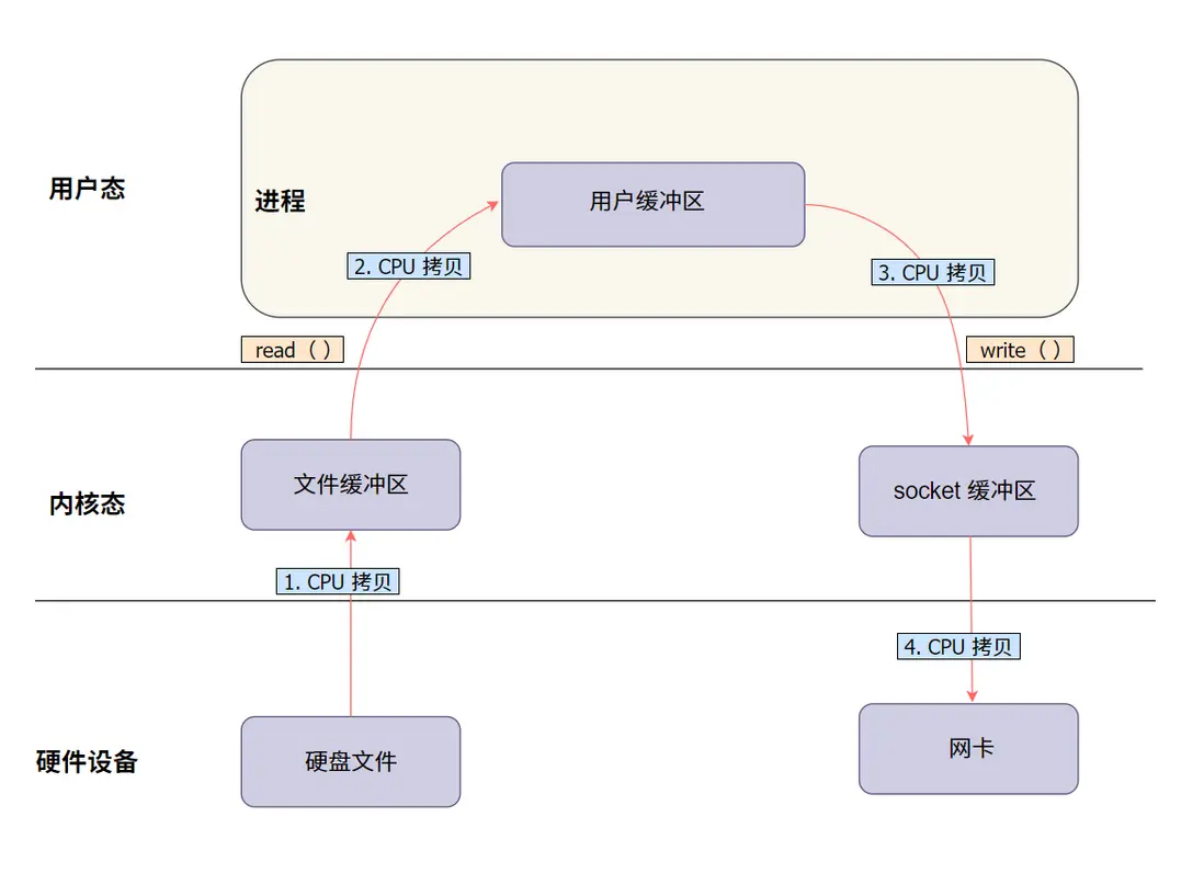 read()和write()調用都需要 CPU 進行多次數據拷貝,嚴重佔用 CPU 資源,影響其他任務的執行。 - 內存佔用:當數據量較大時,內存使用量明顯增加,可能導致系統性能下降。