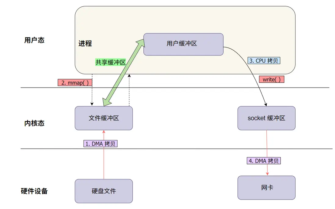 這種方式減少了數據拷貝,提高了效率,適合需要靈活操作數據後再發送的場景。通過這種方式,數據不需要顯式地從內核空間拷貝到用户空間,而是通過映射的方式共享,從而減少了不必要的拷貝。