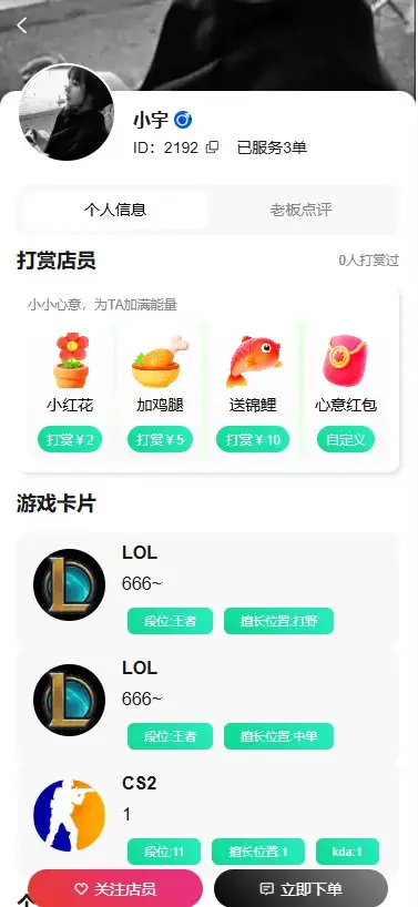 展示平台認證打手的資料:主打遊戲、歷史段位、勝率、接單量、好評率。這是建立信任的關鍵。 - 打手端 (Uniapp App/小程序)