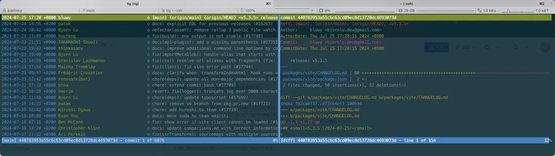 在任意已經初始化 git 的項目,打入 tig ,然後你就可以使用 vim 的方式來操作了 jk 等等