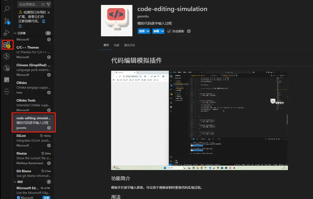 插件目前已經發布到了vscode插件應用商城,可以直接在vscode插件中搜索 code-editing-simulation ,如下圖: