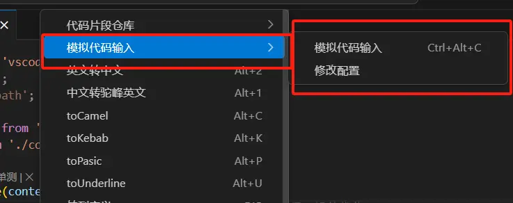 安裝完插件之後,在文件編輯區域右鍵打開菜單欄,可以看到模擬代碼輸入這一個選項,鼠標懸浮可以看到子菜單郵有兩個功能。