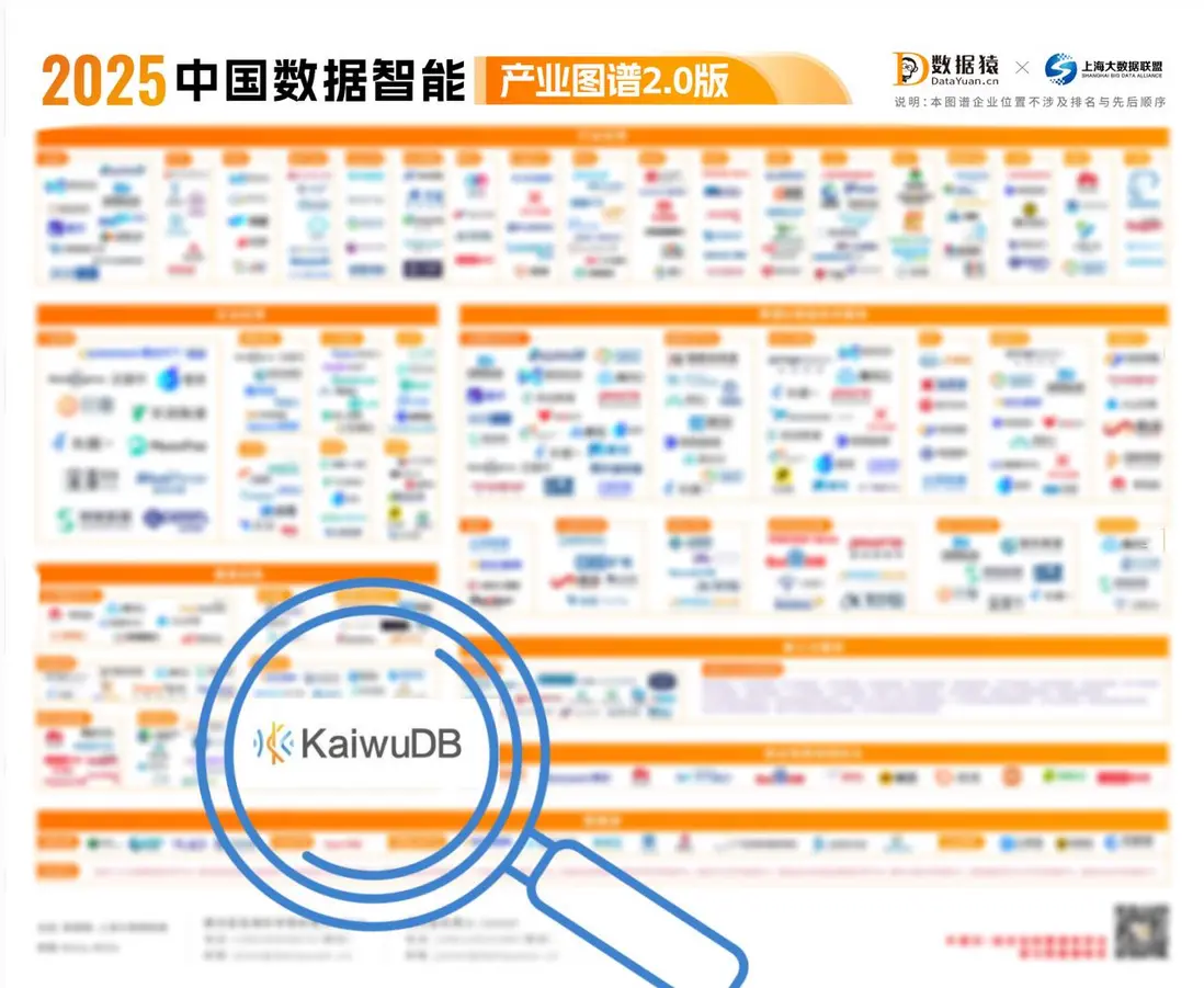 10 月,大數據行業權威媒體數據猿與上海大數據聯盟聯合發佈了《2025 中國數據智能產業圖譜 2.0 版》,全景描繪了中國數據智能產業最新市場格局、技術趨勢、企業動態。KaiwuDB 憑藉在"DB+AI"與"Data+AI"領域的技術積累與場景落地能力,連續第二年入選該圖譜的【基礎設施-數據庫】版塊。