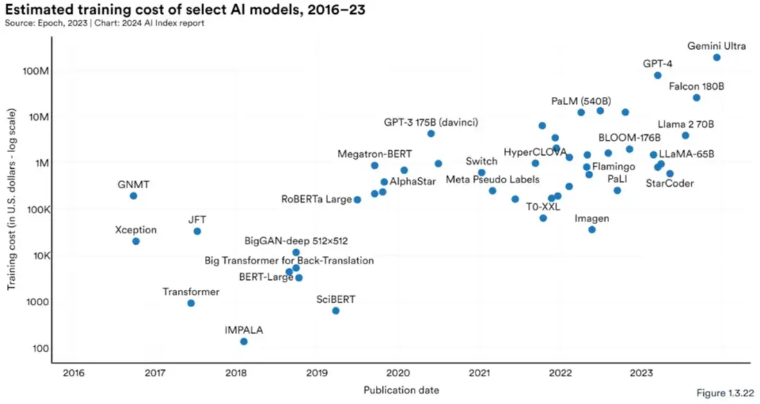 2016-2023 年部分人工智能模型訓練成本估算(圖片來源於網絡)