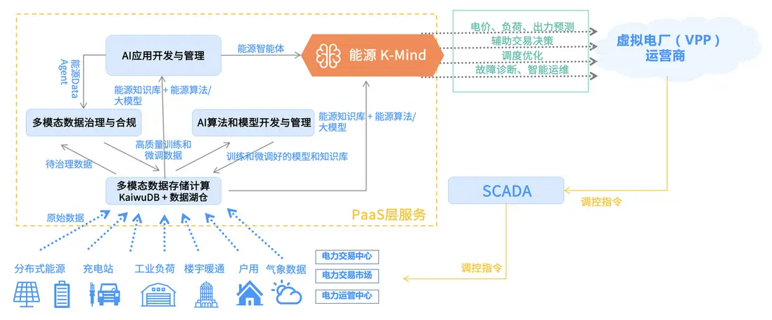 在能源行業,K-Mind 能源業務大腦能夠支撐虛擬電廠(VPP)的運行,通過電價、負荷、出力預測,輔助交易決策,實現調度優化與故障診斷。
