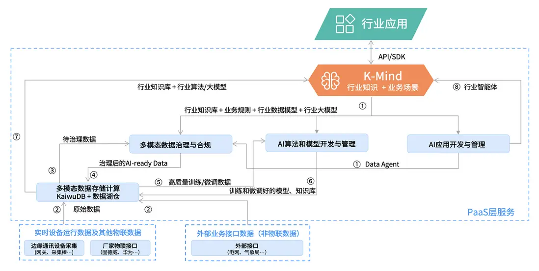 從技術架構來看,K-Mind 採用分層設計,底層依託 KaiwuDB 分佈式多模數據庫與數據湖倉,實現多模態數據的高效存儲與計算;中間層通過多模態數據治理與合規、語義層構建,將原始數據轉化為 AI-ready 數據,為模型訓練提供高質量數據支撐;上層則基於行業知識庫、行業算法和模型庫,構建行業智能體,通過 API/SDK 為應用層提供服務。
