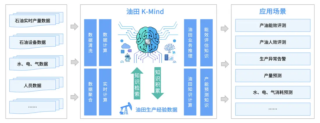 以油氣行業為例,K-Mind 油氣行業大腦可接入石油實時產量數據、設備數據、水電氣數據、人員數據等多源數據,經過數據清洗、聚合、實時計算等處理環節,結合油田生產經驗數據與行業知識,實現產油能效評測、生產異常告警、產量預測等核心應用。