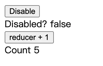 現在問題來了,當disabled props為true時(此時count為0),我們點擊reducer + 1按鈕5次,然後再點擊Disable按鈕(disabled props會變為false),此時count為多少呢?