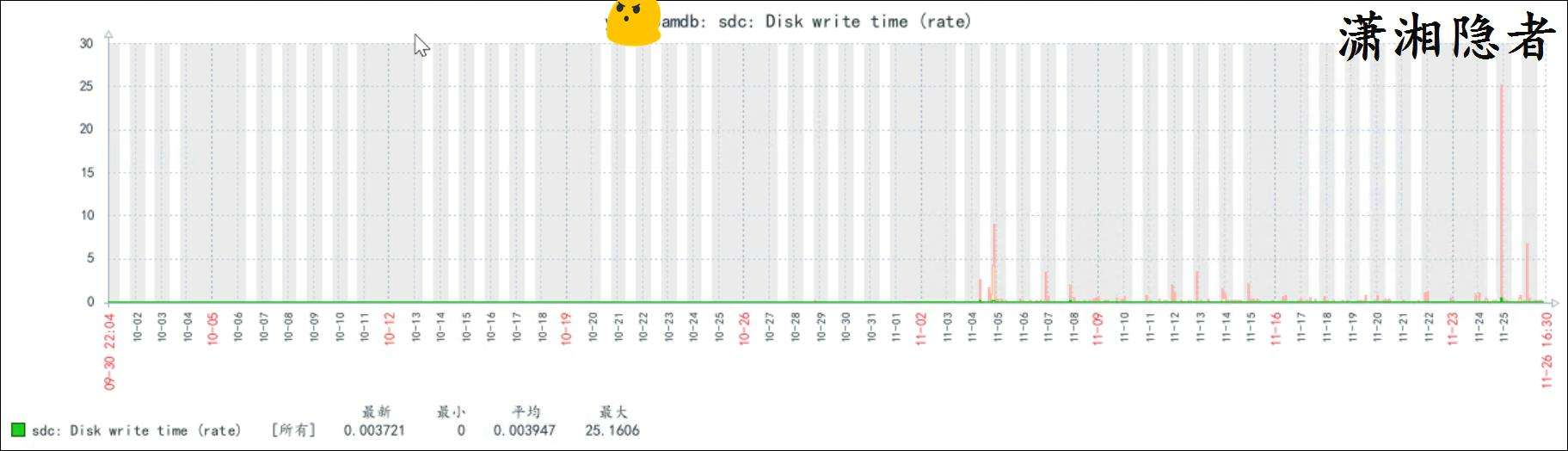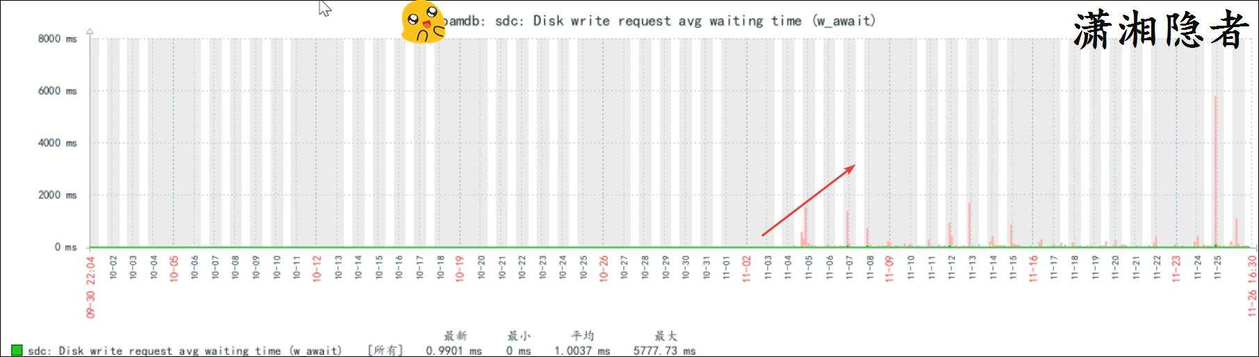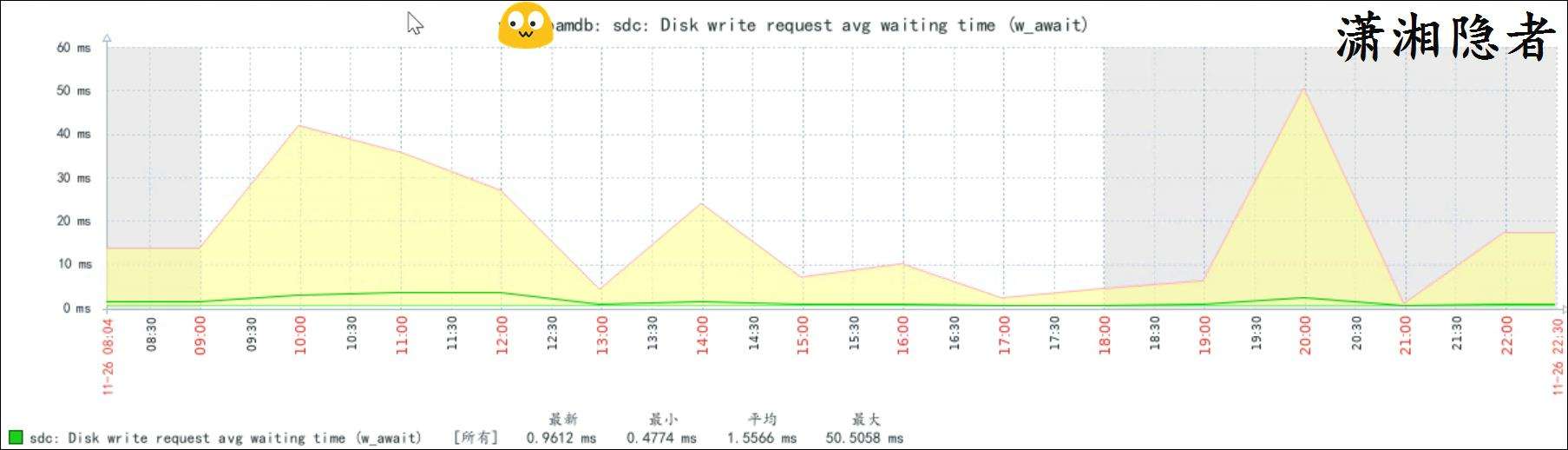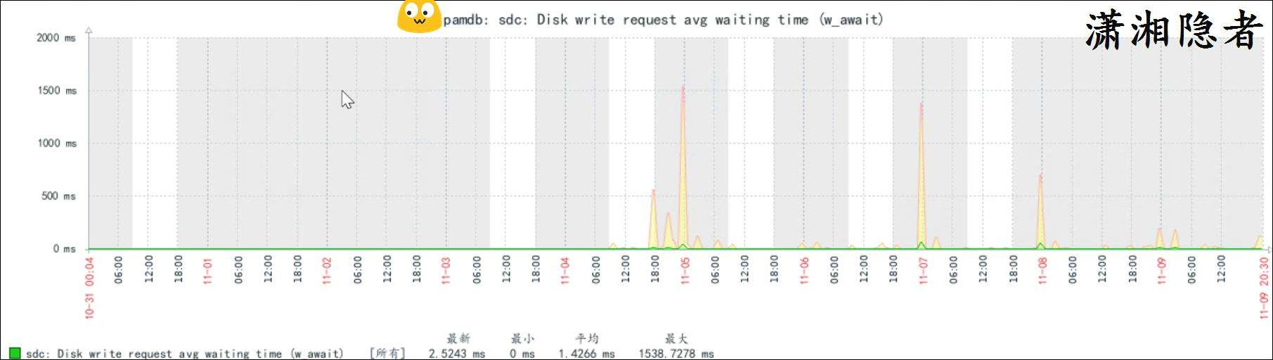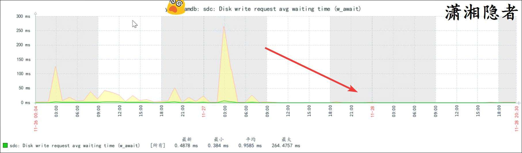 上面圖片可能由於時間範圍拉得太長,對比不是特別明顯,我們將時間範圍縮小,你就能看到磁盤寫的平均等待時間確實在打完補丁後上升了,如下截圖所示