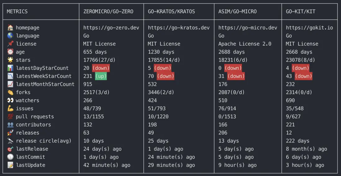 $ github-compare zeromicro/go-zero go-kratos/kratos asim/go-micro go-kit/kit