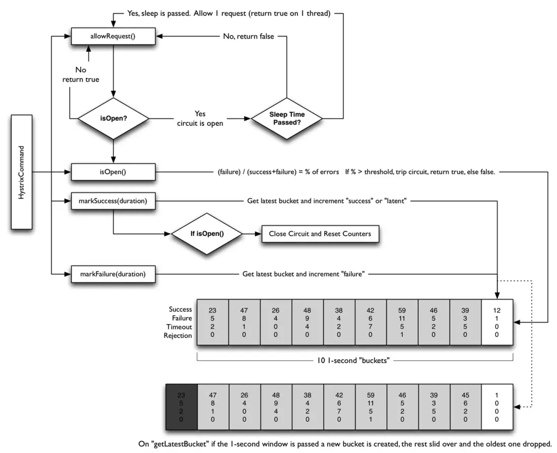 - 有請求來了,首先allowRequest()函數判斷是否在熔斷中,如果不是則放行,如果是的話,還要看有沒有達到一個熔斷時間片,如果熔斷時間片到了,也放行,否則直接返回錯誤。