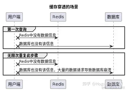 如果是緩存穿透的場景,比如傳一個用户 id 為-1,這個用户 id 在緩存裏面是肯定不存在的,因為每次請求數據庫中也沒有對應的數據信息,那麼數據庫也就不會同步到緩存(Redis)中,所以就會導致,每一次的請求,都會直接打到數據庫上,導致數據庫崩潰。