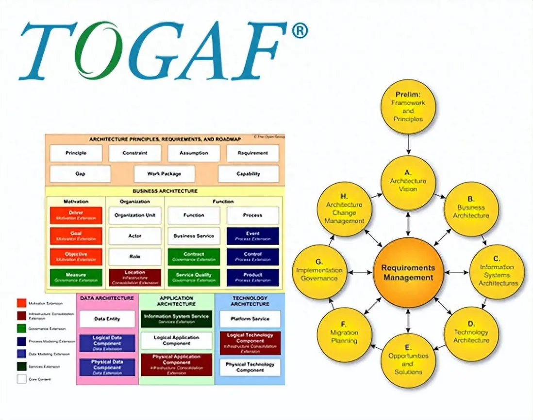 TOGAF(The Open Group Architecture Framework)是由The Open Group組織開發的一種企業架構框架,它提供了一套方法論、工具和術語,用於幫助組織設計、規劃、實施和管理企業架構。TOGAF框架的核心是其架構開發方法(ADM),它是一個迭代的過程,包括了從架構願景到架構實施的各個階段。