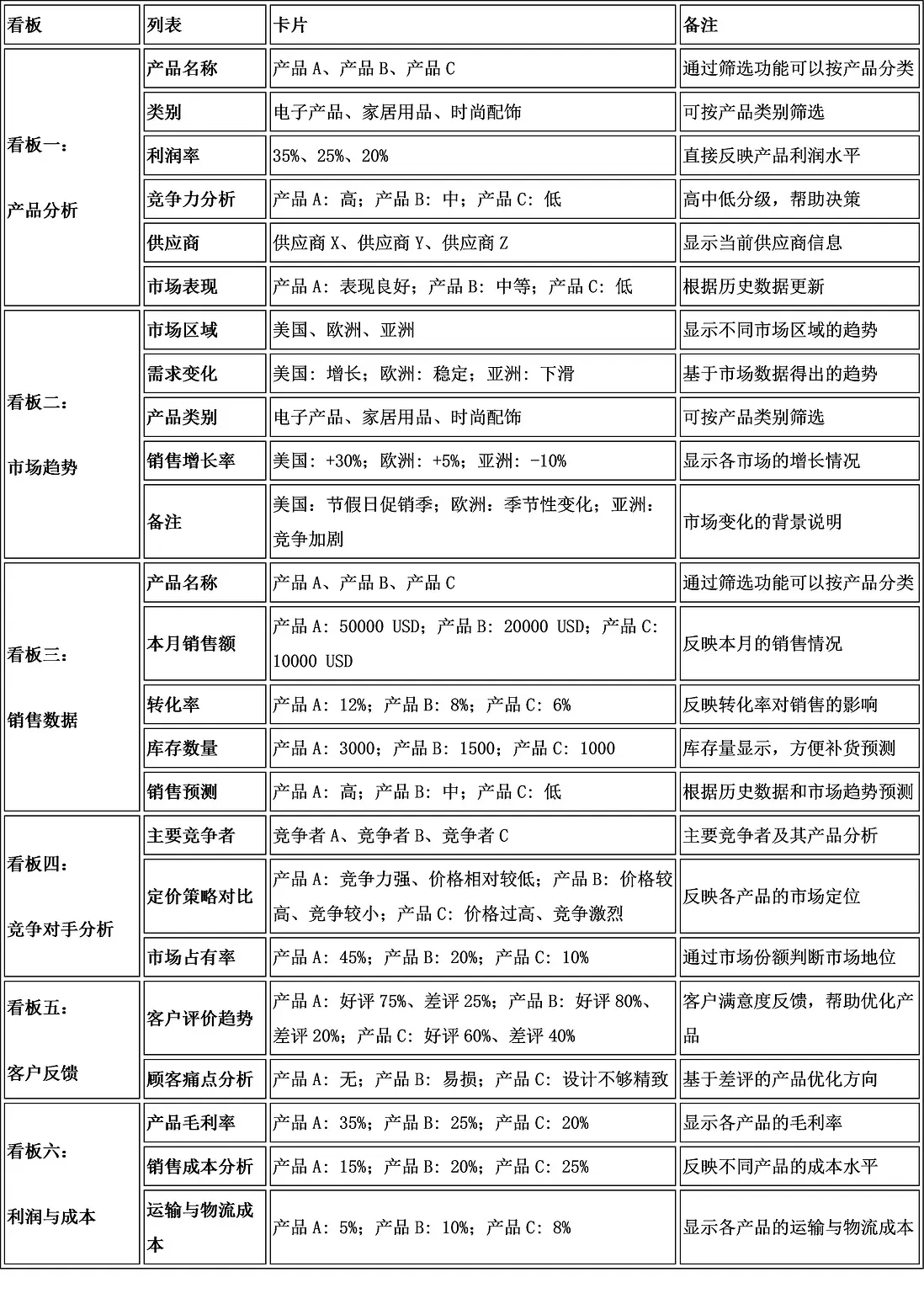 通過選品看板集的搭建,跨境電商選品團隊可以更高效地追蹤跨境電商的產品表現、市場動態以及競爭格局,為戰略決策提供有力支持。