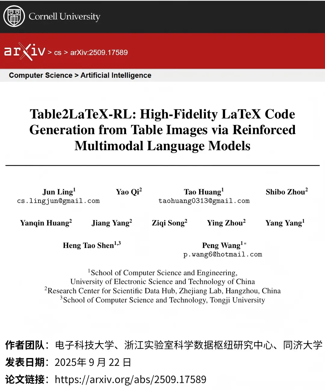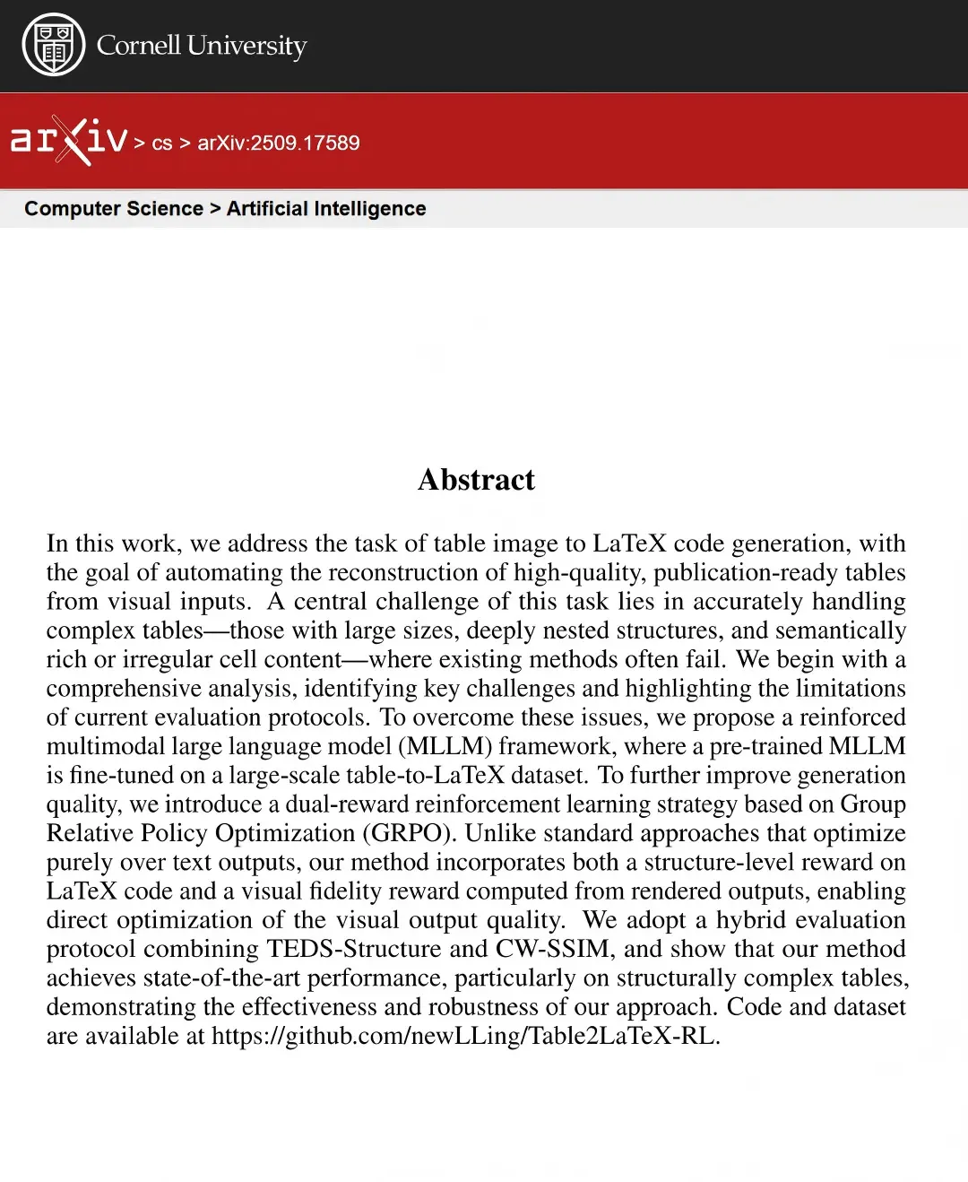 在科學文檔與技術報告的自動化處理過程中,表格作為數據呈現與結構化表達的重要形式,其準確重建對於文檔數字化具有關鍵意義。現有的表格識別方法多聚焦於生成 HTML 結構,難以滿足學術出版中對版式、語法及數學內容精度的嚴格要求。特別是對於包含多級表頭、複雜合併單元格及符號表達的表格,現有系統往往在結構一致性和可編譯性方面表現不足。因此,如何從表格圖像中直接生成語法正確、視覺一致的 LaTeX 代碼,成為表格理解領域的核心挑戰。
