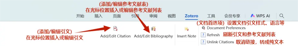 這應該是很多人用 Zotero 的核心需求 ——Word、WPS、LibreOffice都能裝對應的插件,寫作時想插引用,鼠標點一下就能插入規範格式,參考文獻列表也能一鍵生成。