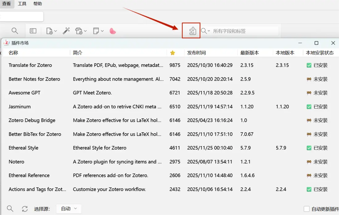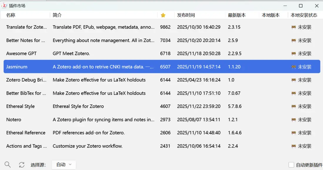 下圖我們以安裝Jasminum(茉莉花) 插件為例進行展示,該插件可以抓取知網上文章。首先,在插件市場找到Jasminum(茉莉花) 插件。