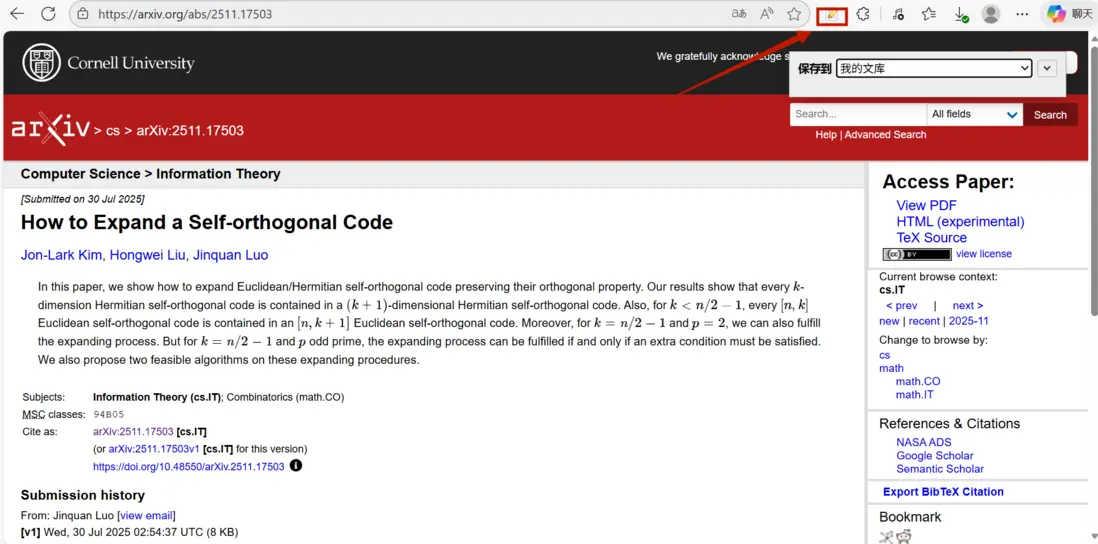 您可以隨機打開一個arxiv上的文章,點擊擴展即可顯示保存到我的文庫中,也可以可以保存到其他文件夾中。